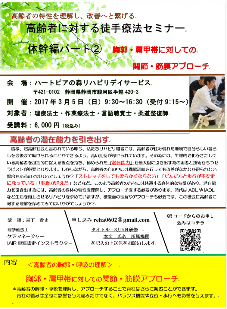 3月5日 高齢者に対する徒手療法セミナー <胸郭・肩甲帯に対しての 関節・筋膜アプローチ>