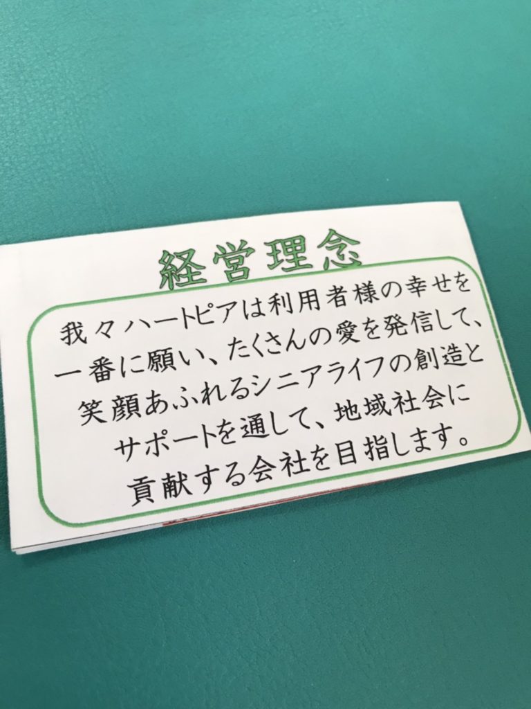 このカードにはハートピアの経営理念等、基本方針が書いてあります。スタッフは全員このカードを持ち、朝礼で読み合わせを行なっています。
