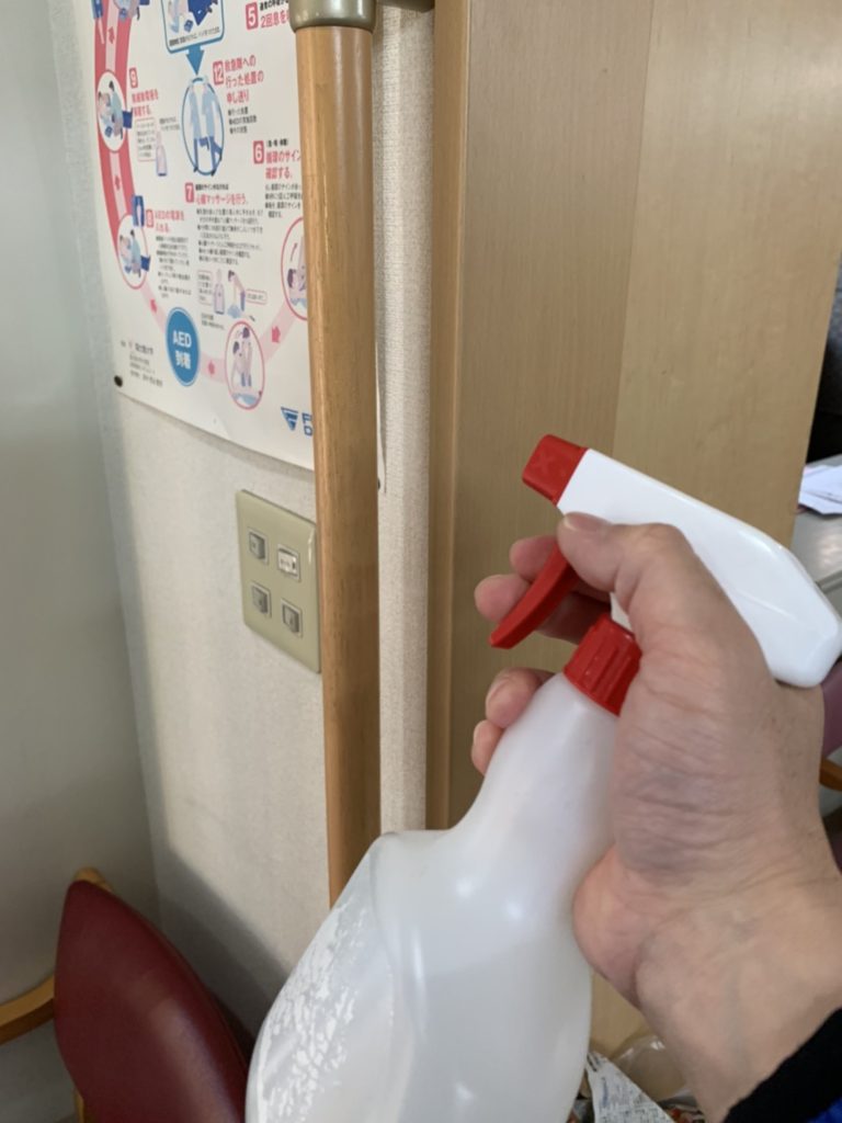 そして、テーブルや椅子、手すり、車椅子・・・などなど徹底的に消毒を行いご利用者さまの健康に努めております