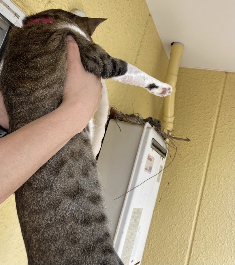 窓を開けるとずーっと上を見上げているので何を見てるのかなー?と何日か続いた後にふと気になって旦那さんと猫の視線の先を見てみると、ベランダの隅っこの上の方に鳩の巣が‼️