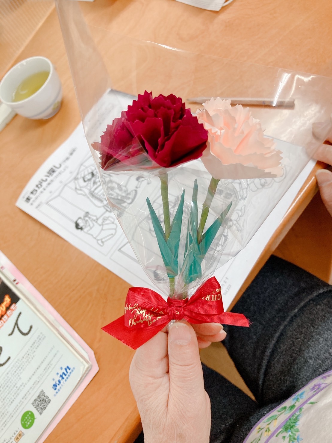 母の日 2022.05.06デイサービス部門, ブログ こんにちは! リハビリデイサービスです! 本日も皆様元気にリハビリに取り組まれとても賑やかな1日となりました 今週の日曜日は母の日ということで、 女性の皆様に感謝の気持ちを込めて、カーネーションの花束をプレゼントさせていただきました! 皆様に大変喜んでいただき、中には涙するご利用者様も スタッフも皆笑顔でほっこりとした1日でした デイサービス部門, ブログ スリングセラピー 梅とカエル