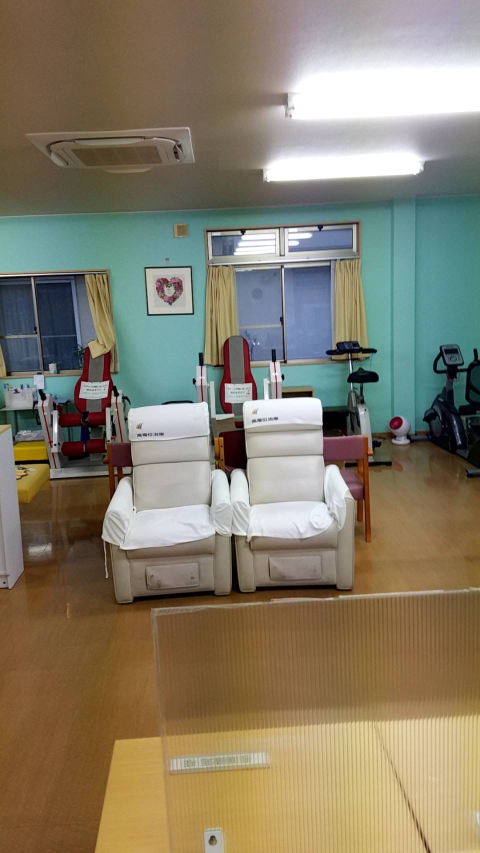 日当たりの良い方に利用者様のお席をおいてマシンや自転車を壁側にしました。