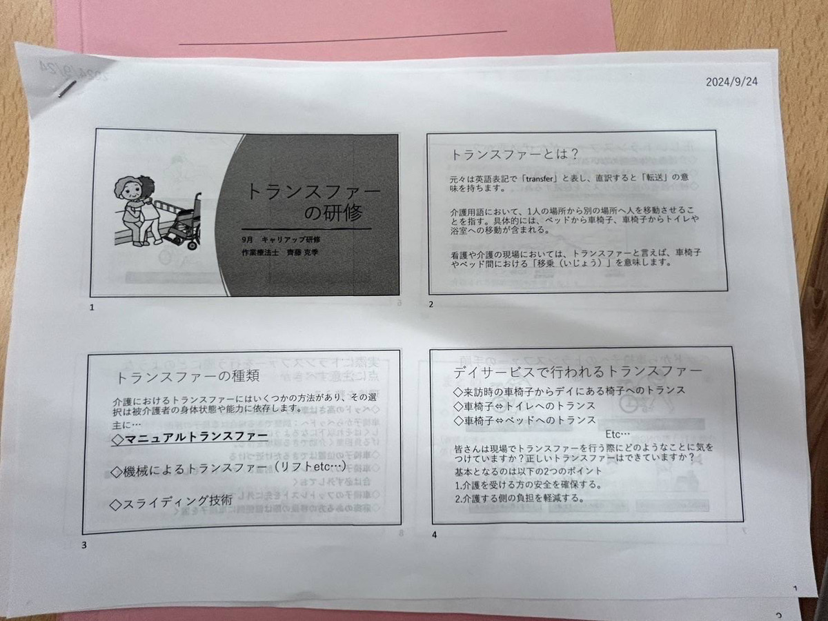 デイサービスで働く上でトランスファーは切っても切り離せないものです。介護事故は起こさないのはもちろん、現場で自然と助け合う環境をつくる事が更なるハートピアの質の向上に繋がると改めて思いました😊
