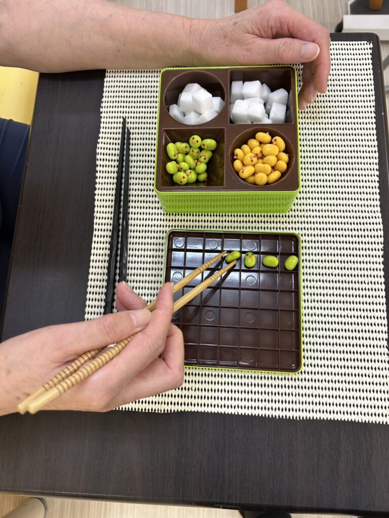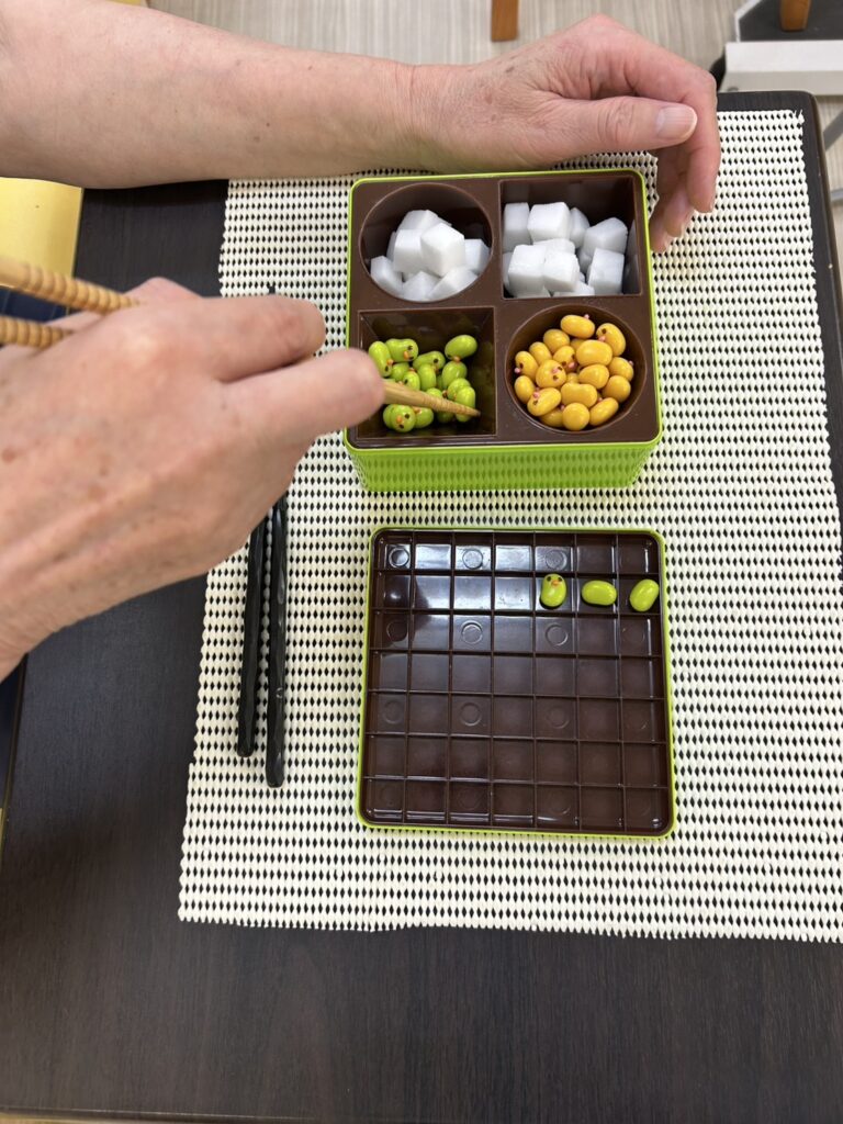 箸を持つ手や指の可動域、豆をつかむまでの距離、感覚、どのくらいの力でつかめばいいか、などなど…