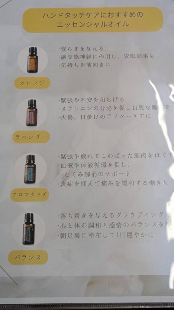 また、アロマオイルの香りと手の温もりが融合することで、安心感や幸福感を生み出し、心身のバランスを整えストレスの軽減やリラックス効果があるそうです