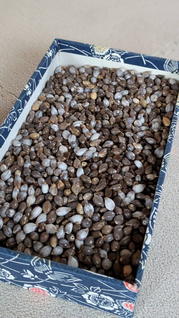 黒褐色でツヤツヤしたジュズ玉に魅了され、数年前に採って乾燥させたものが箱いっぱいです!
