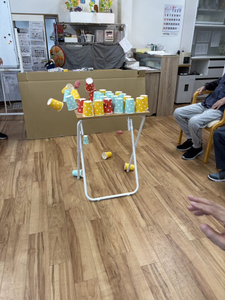 レクは、机にある紙コップを投げて倒すゲームです。