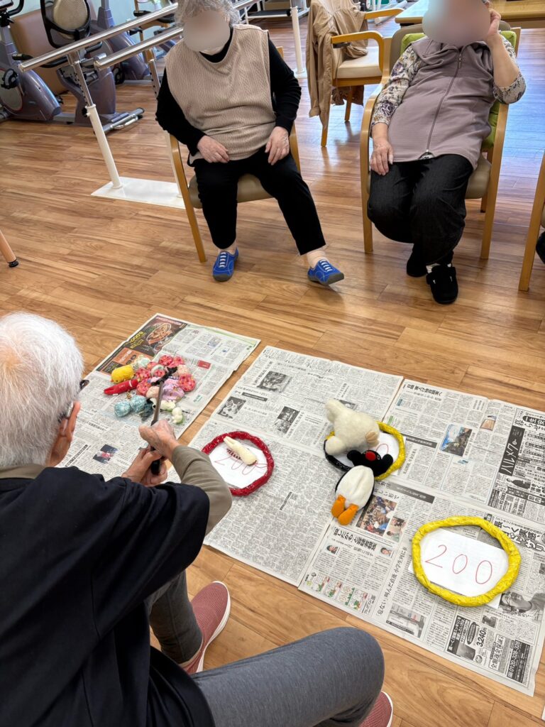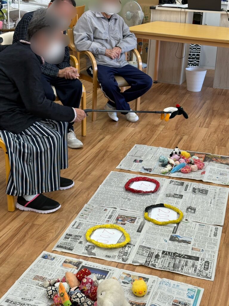 マジックハンドを使って 2025.11.20デイサービス部門, ブログ, 東新田 こんにちは 東新田デイの西岡です😊 今日もいい天気ですねー☀️ 送迎中に富士山も綺麗に見えました🗻 レクはマジックハンドを使って、ぬいぐるみなどを掴んで点を競うゲームです! これは掴む動作や手先を使うので、リハビリにもなるので良いですね。物が重かったりすると、落ちてしまったり上手く掴めなかったりします。 「落ちないでね〜!」・「固くて重いね〜」など声が聞こえてきましたが、何とか皆さん掴むことができて、いい勝負になりました✨ デイサービス部門, ブログ, 東新田 ボールを使った運動 立ち上がりについて
