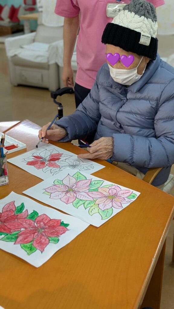 絵の具を使い素敵にポインセチアを塗ってくれる利用者も